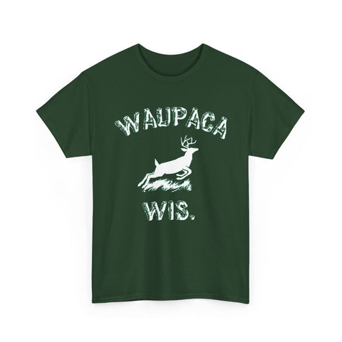 A forest-green cotton tee stamped with rustic, hand-drawn lettering that reads Waupaca Wis. and a leaping whitetail silhouette. Soft yet sturdy, this shirt carries the quiet energy of early mornings on the river and long afternoons tracking trails through oak and pine. Wear it to share a hometown nod or to layer under a flannel for cooler evenings. The printed sleeve and inner neck details add subtle craftsmanship without shouting, so it pairs easily with denim, boots, and favorite outdoor routines.