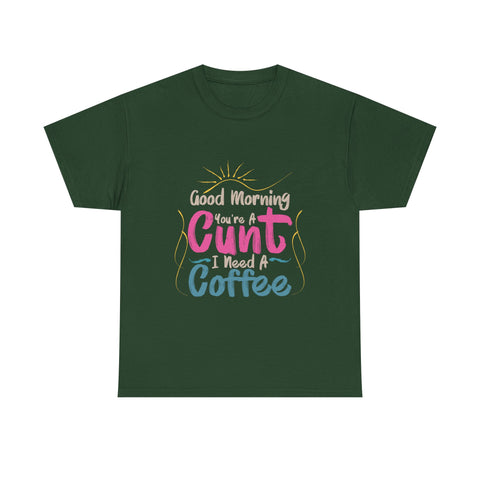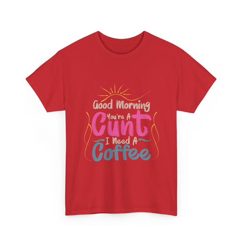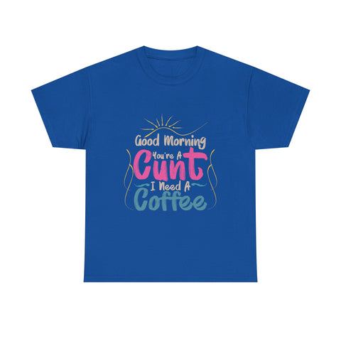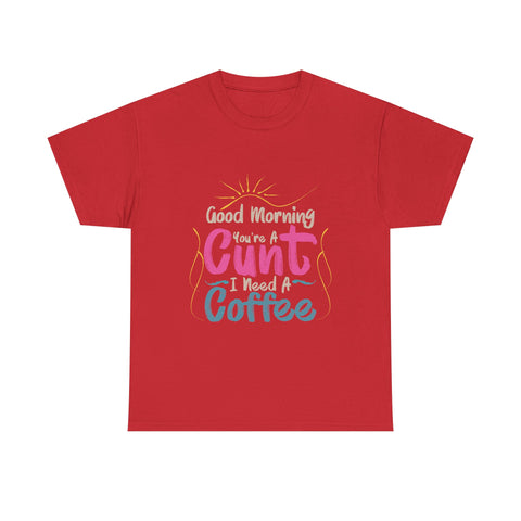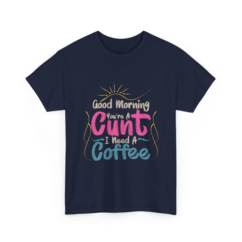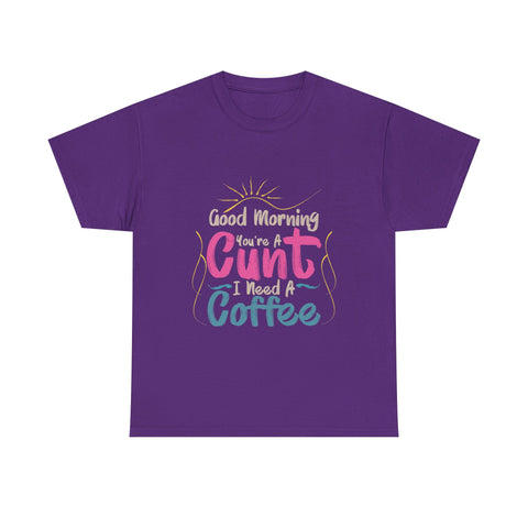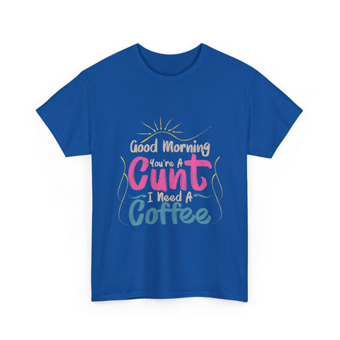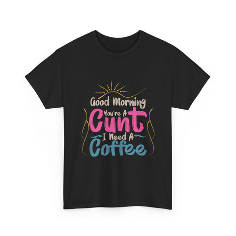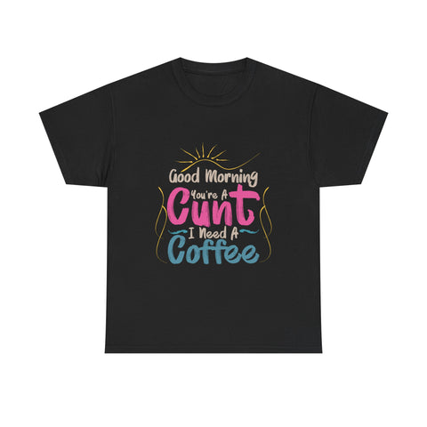 This soft, midweight tee carries an unapologetically snarky morning message in bright, playful colors. The relaxed, classic cut drapes easily over casual outfits and makes the bold statement front-and-center — great for coffee runs, lazy weekends, or mornings when only a strong brew and sharp humor will do. The ribbed crew neck stays shaped wash after wash, while the tear-away label keeps you comfortable all day. Subtle sunburst and line accents frame the lettering, giving the design a cheeky, energetic vibe that pairs well with jeans, joggers, or an oversized cardigan.