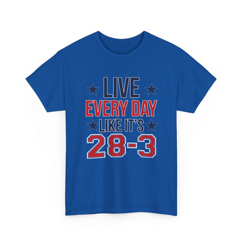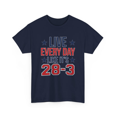 Wear this tee like a badge of a comeback. Bold block letters and star accents shout resilience—Live every day like it’s 28–3—on a sturdy black shirt that feels familiar from the first wear. The relaxed crew fit and soft, midweight cotton sit comfortably whether you’re cheering at the game, meeting friends at the bar, or replaying that legendary turnaround in your head. The print’s strong colors keep their punch, and the tear-away label keeps the neck itch-free. It’s the kind of shirt you grab when you want to feel fierce, nostalgic, and a little defiant all at once.